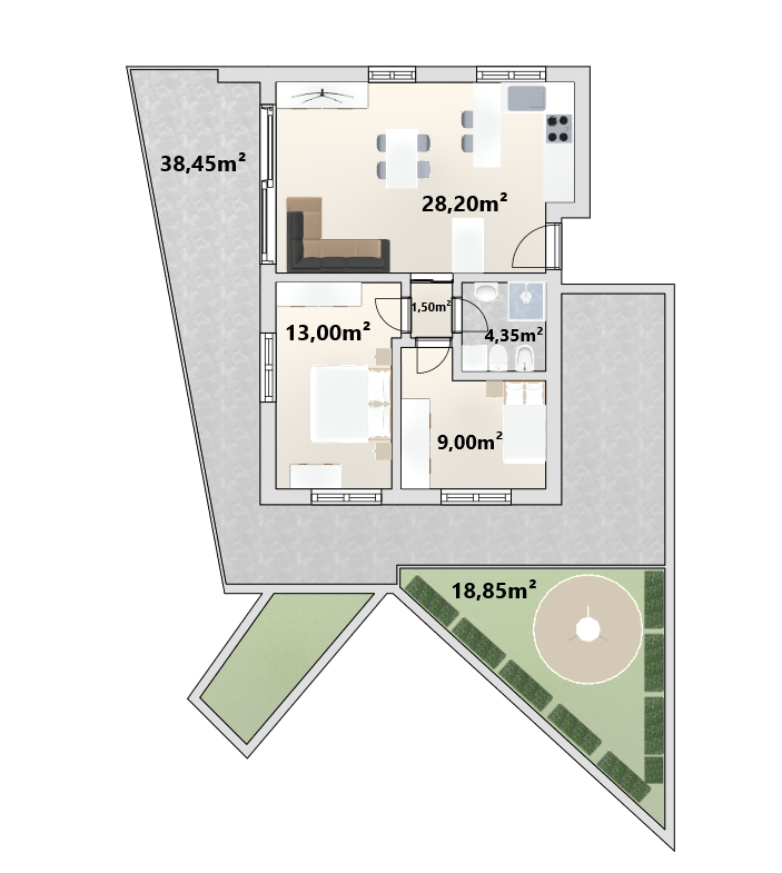 L'appartamento n. 01 è situato al piano terra ed è composto da un soggiorno con accesso al giardino di 90mq e una cucina con accesso al balcone, una stanza da letto matrimoniale, una stanza da letto singola e un bagno.