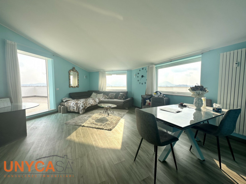 - Lâingresso si apre su una straordinaria zona living open-space, ampia e luminosa, con cucina a vista e grandi vetrate che collegano direttamente lâinterno alla splendida terrazza panoramica che avvolge lâabitazione.