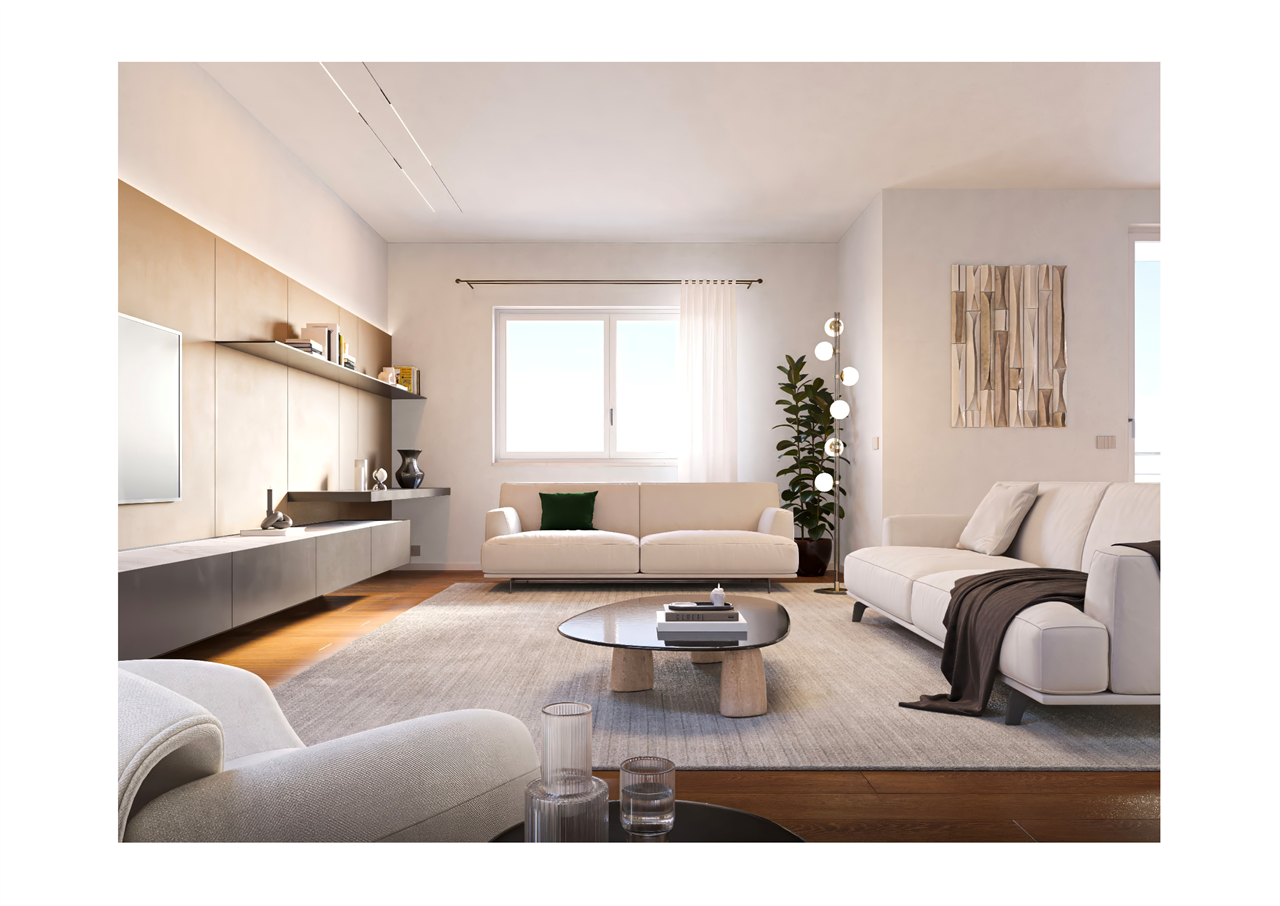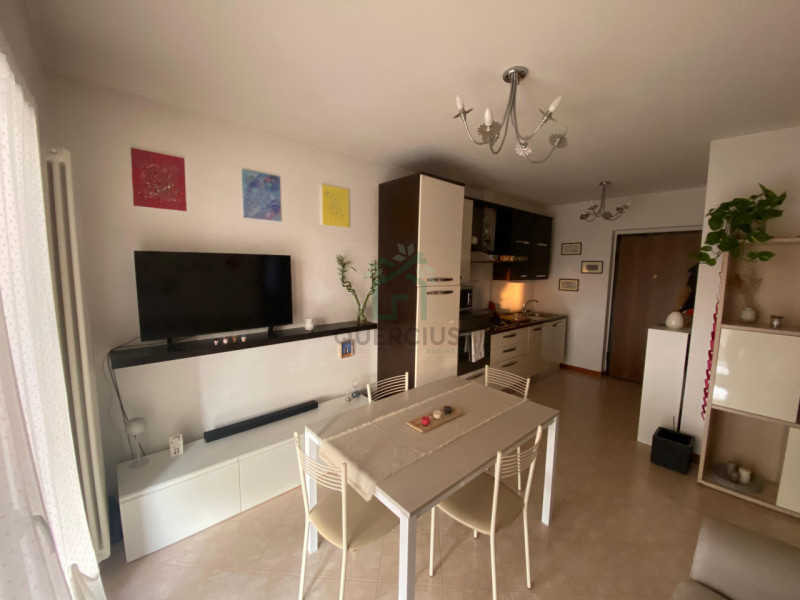 L'appartamento si presenta con un design moderno e luminoso, grazie alle ampie finestre che offrono una vista sul giardino condominiale interno. Gli spazi sono ottimizzati al meglio: la zona giorno include un comodo angolo cottura attrezzato e uno spazio living versatile, mentre la zona letto è ben definita per garantire privacy e comfort.