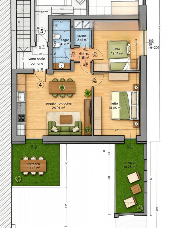 FINITURE: Pavimenti in gress porcellanato, serramenti interni in PVC con vetrocamera ed esterni avvolgibili; porte bianche, sanitari di design, colori di tendenza, predisposizione impianto di climatizzazione.