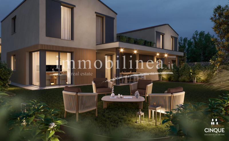 Gli ambienti sono completati da serramenti in legno con vetrocamera, zanzariere su tutte le finestre e tende parasole motorizzate, dettagli che rendono la casa pronta da vivere.