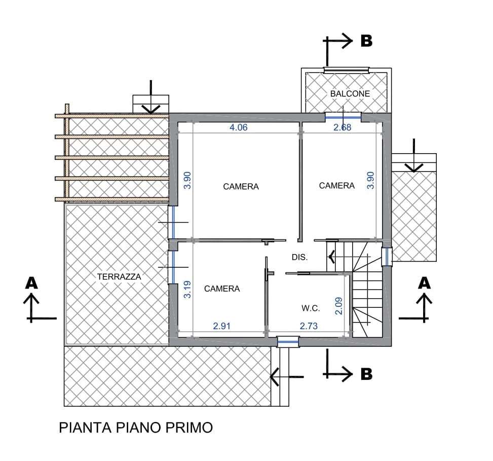 Piano primo tre camere di cui due con balcone e servizio.