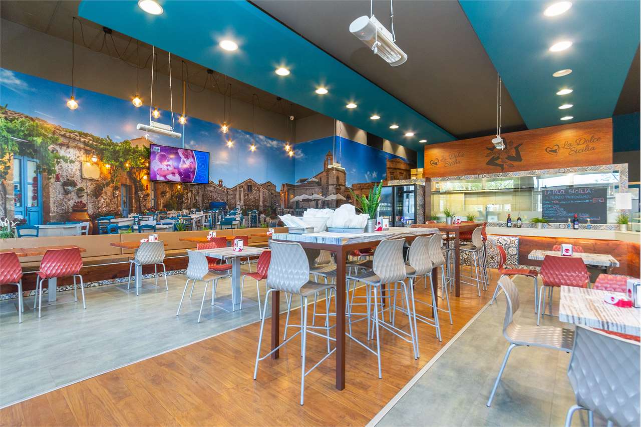 All'interno, l'accoglienza è affidata a unâarea d'ingresso dal design moderno, caratterizzata da un elegante bancone bar e una zona per preparazioni a vista che valorizza l'offerta gastronomica. La parte operativa, situata sul retro, è studiata per la massima efficienza: dispone di una cucina professionale con canna fumaria, magazzino, spogliatoio per lo staff e servizi igienici a norma per disabili.