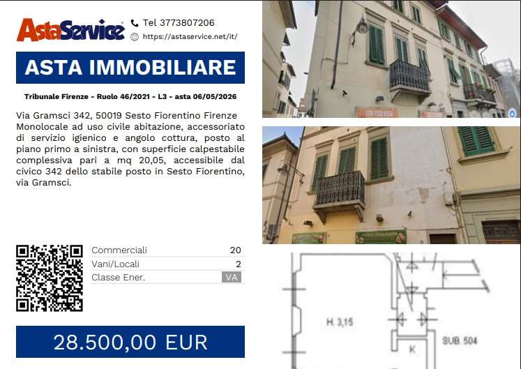 Monolocale ad uso civile abitazione, accessoriato di servizio igienico e angolo cottura, posto al piano primo a sinistra, con superficie calpestabile complessiva pari a mq 20,05, accessibile dal civico 342 dello stabile posto in Sesto Fiorentino, via Gramsci.