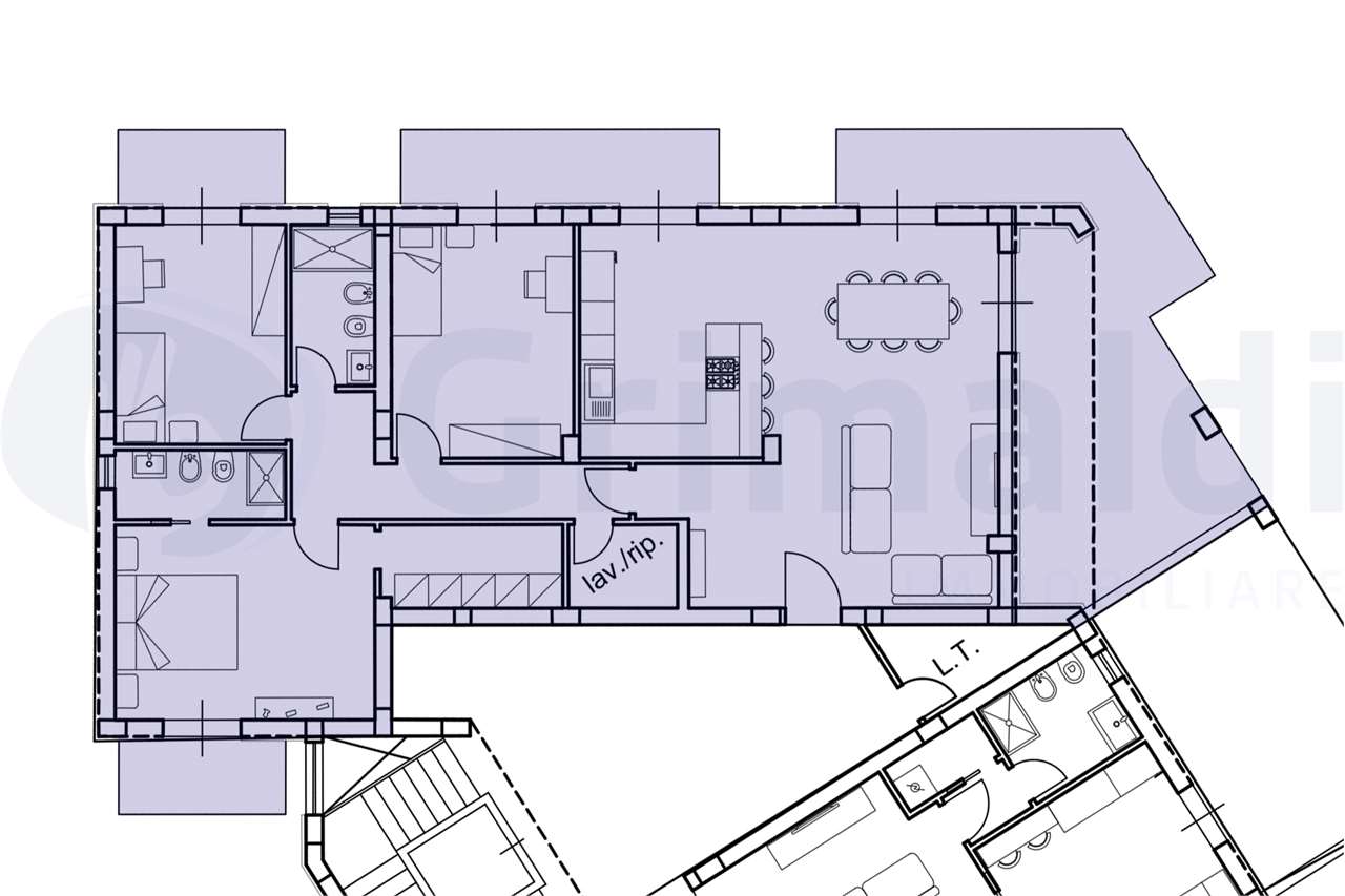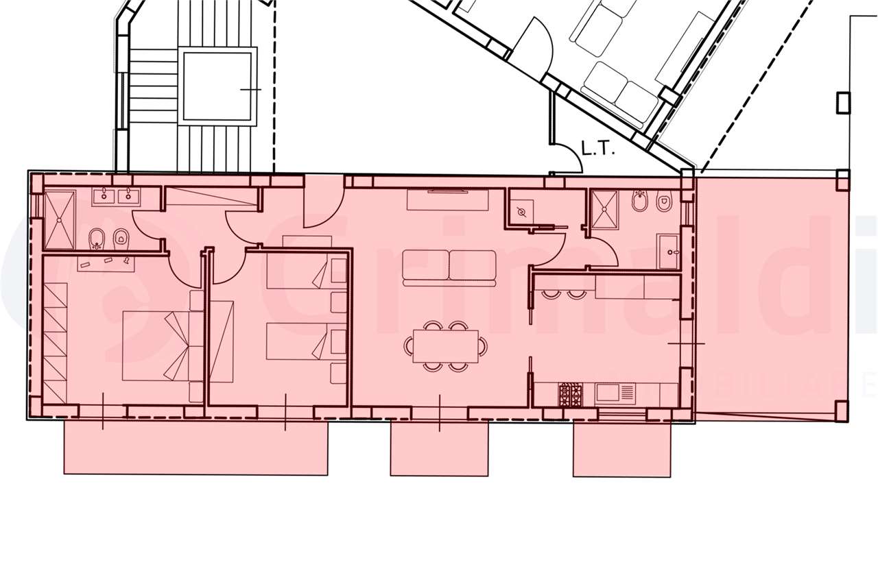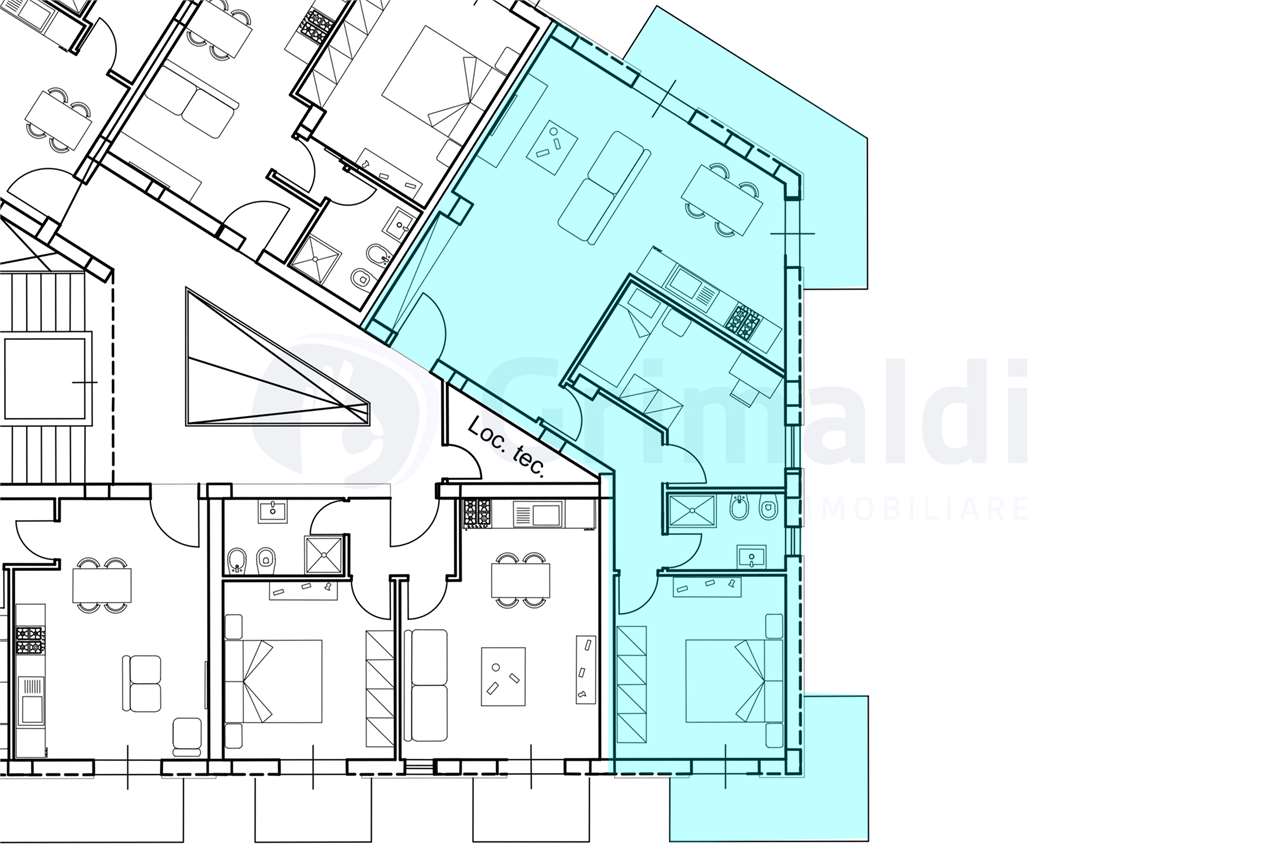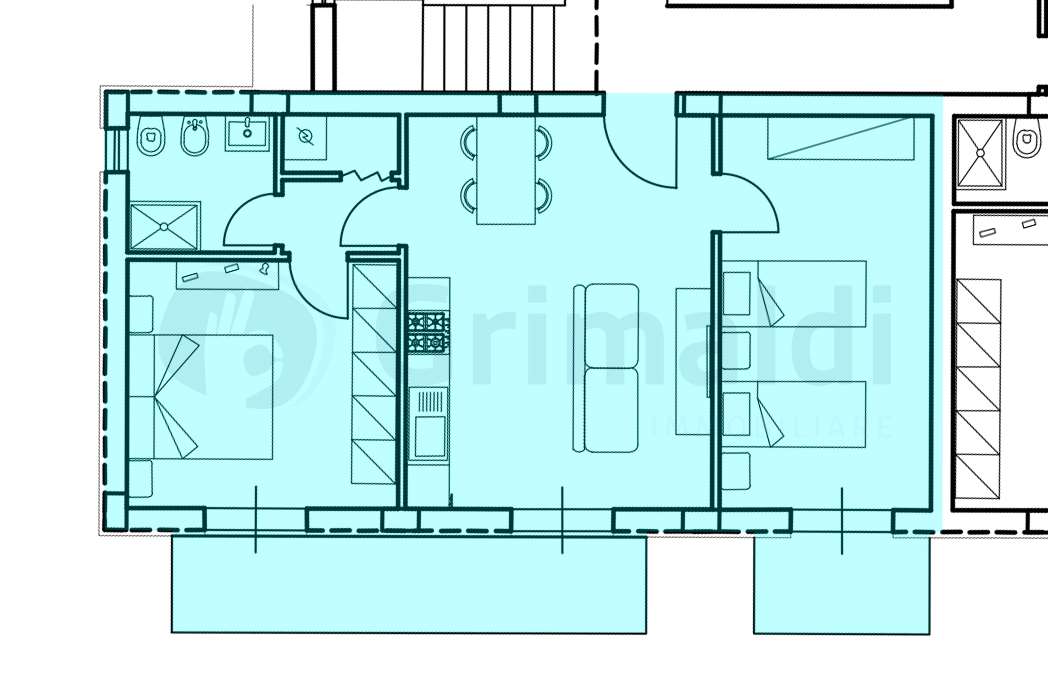 Trilocale con soggiorno, cucina, 2 camere da letto e 2 bagni per un totale di 100mq interni e due balconi per un totale di 16mq.