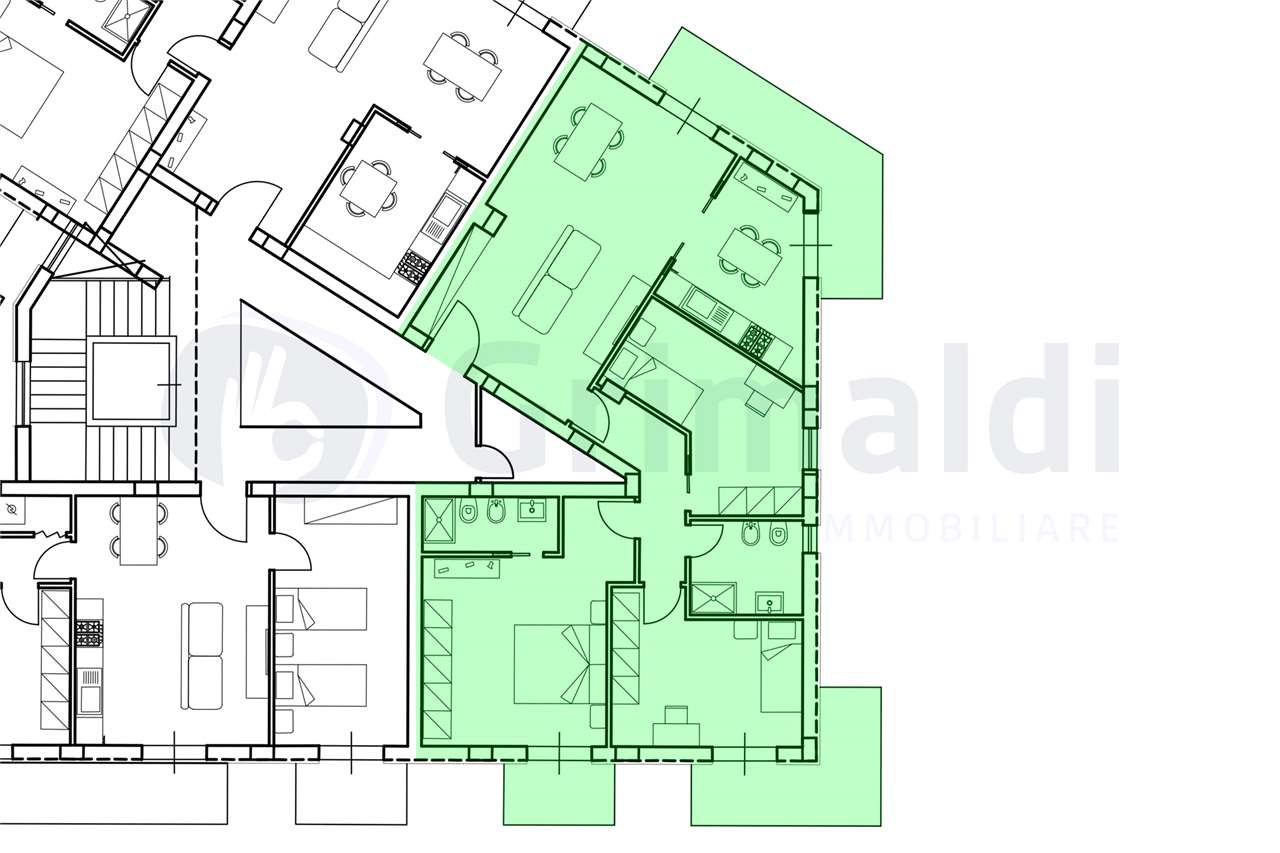 Quadrilocale con zona living (soggiorno/cucina) che si affaccia su una grande veranda, 3 camere da letto, di cui una con cabina armadio, 2 bagni e ripostiglio per un totale di 100mq interni, due balconi per un totale di 16mq e ampia veranda di 23mq
