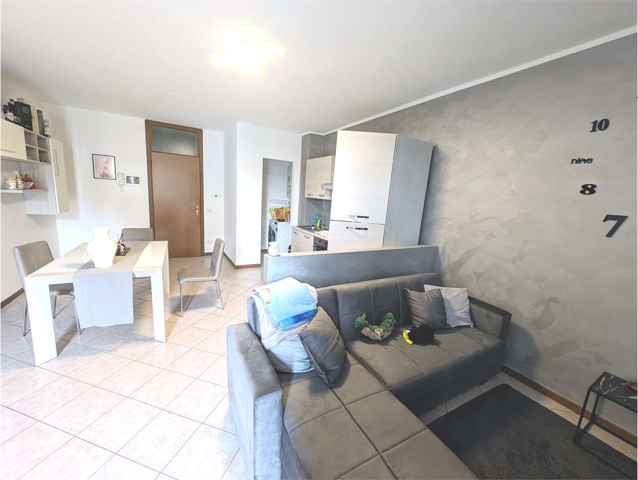 L'appartamento si apre su un disimpegno d'ingresso che conduce, da un lato, alla zona giorno/notte con divano letto, cucina a vista e tavolo da pranzo: un ambiente compatto, funzionale e ben organizzato, ideale per sfruttare al meglio ogni spazio.