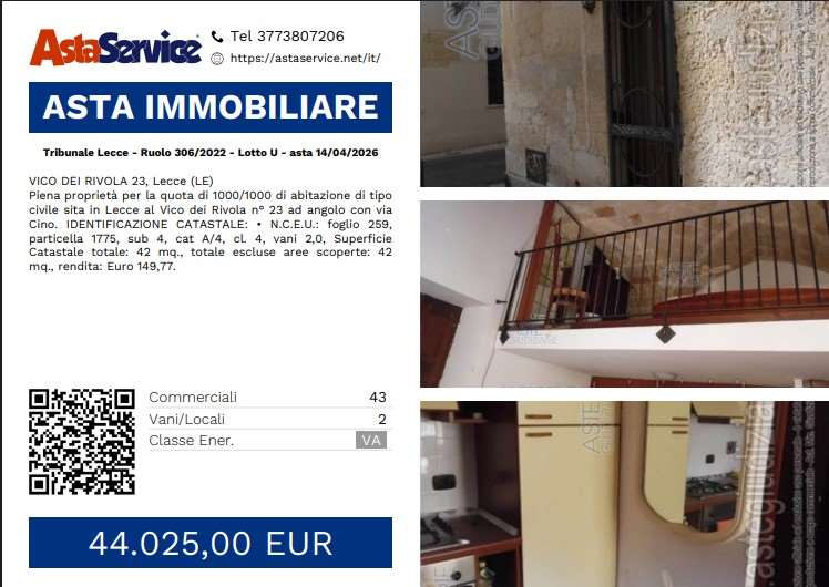 Piena proprietà per la quota di 1000/1000 di abitazione di tipo civile sita in Lecce al Vico dei Rivola n° 23 ad angolo con via Cino. IDENTIFICAZIONE CATASTALE: N.C.E.U.: foglio 259, particella 1775, sub 4, cat A/4, cl. 4, vani 2,0, Superficie Catastale totale: 42 mq., totale escluse aree scoperte: 42 mq., rendita: Euro 149,77.