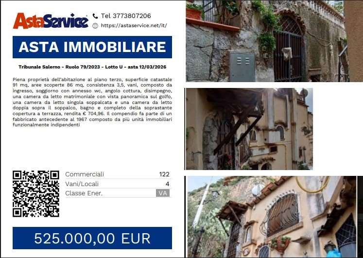 Piena proprietà dell'abitazione al piano terzo, superficie catastale 91 mq, aree scoperte 86 mq, consistenza 3,5, vani, composto da ingresso, soggiorno con annesso wc, angolo cottura, disimpegno, una camera da letto matrimoniale con vista panoramica sul golfo, una camera da letto singola soppalcata e una camera da letto doppia sopra il soppalco, bagno e completo della soprastante copertura a terrazza, rendita EURO 704,96. Il compendio fa parte di un fabbricato antecedente al 1967 composto da più unità immobiliari funzionalmente indipendenti