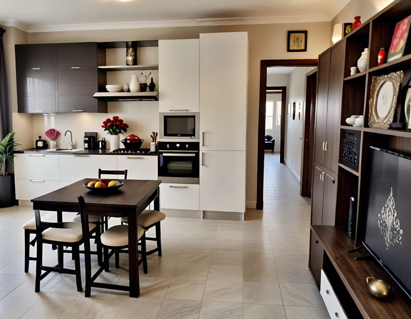 La soluzione offre spazi ben distribuiti su circa 70 mq: ingresso accogliente, soggiorno-cucina open space dal design moderno ed estremamente luminoso grazie alle ampie vetrate; cucina attrezzata completa di elettrodomestici ad incasso e arredi contemporanei. La zona giorno è arricchita da dettagli curati come il tavolo in vetro temperato, illuminazione sospesa dâeffetto e living con divano angolare perfetto per momenti di relax.