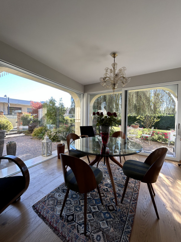Noale, proponiamo in vendita una raffinata casa singola che si distingue per la luminosissima zona giorno grazie alle grandi vetrate che affacciano sul curato giardino privato.