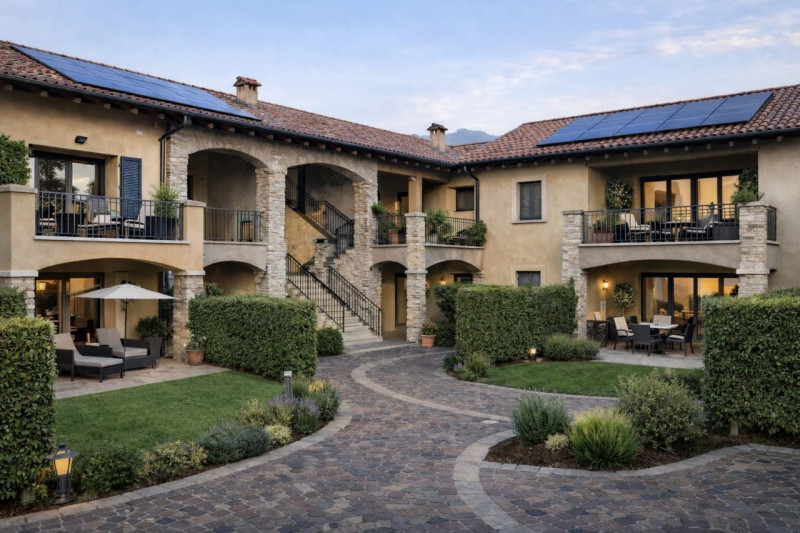 Il complesso residenziale dove l'attenzione ai dettagli incontra l'eleganza architettonica. La corte interna racchiude gli edifici in modo armonioso e protetto, mentre la piscina è studiata per offrire un'esperienza di relax e divertimento circondata dal verde.