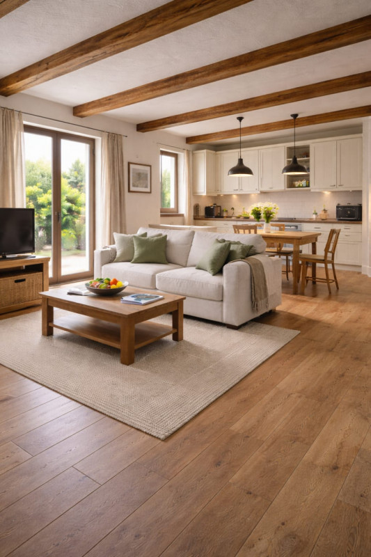 Lâingresso si apre su una luminosa zona living con cucina a vista, impreziosita da pavimenti in rovere europeo e travi sbiancate a vista che donano calore e carattere agli ambienti. Le ampie aperture collegano direttamente al giardino privato, uno spazio verde riservato, ideale per momenti di relax, cene allâaperto o per chi desidera vivere lâesterno come naturale estensione della casa.