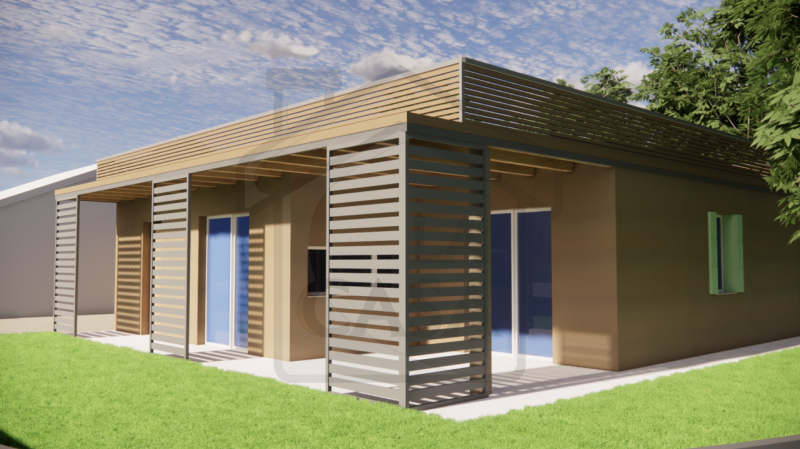 A completamento della soluzione proposta due posti auto coperti oltre a due casette in legno adibite a ripostiglio e ricovero attrezzi.