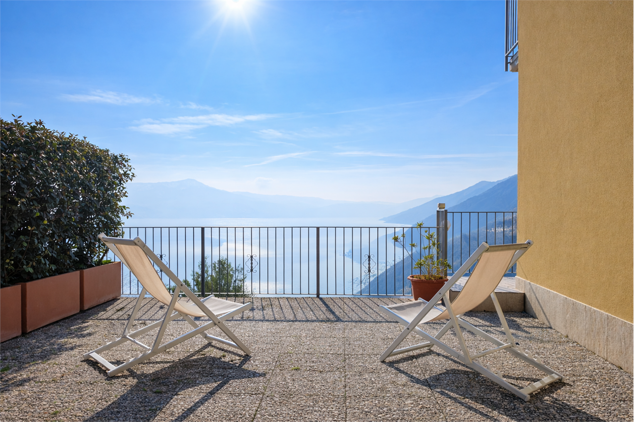 Una scala interna porta al livello superiore, impreziosito da travi a vista, dove trovano spazio due camere da letto e un secondo bagno sempre finestrato. Dalla camera padronale si accede a un ulteriore terrazzo panoramico con vista ampia e suggestiva sul Lago d'Iseo.
