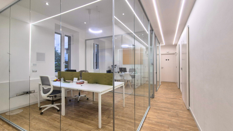 La climatizzazione è garantita da fan coil e split, mentre gli infissi bianchi a taglio termico assicurano silenzio e benessere durante tutta la giornata. Gli spazi sono suddivisi in più aree operative, perfette per studi professionali, progettazione, formazione (già accreditato per corsi regionali) o soluzioni moderne di coworking.