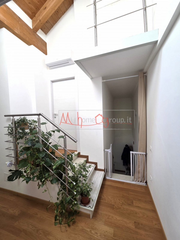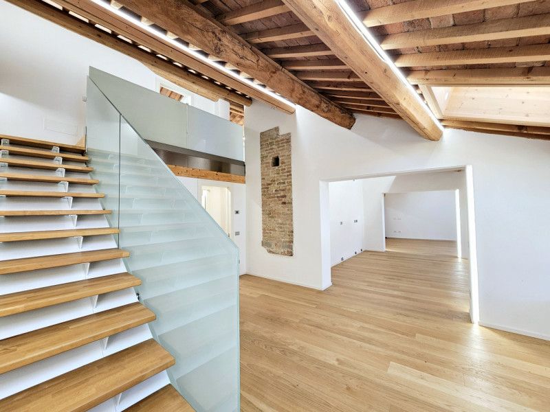 La scala originale in legno conduce al mezzanino, dove si trova un ampio bagno finestrato. Al primo piano si sviluppa la zona notte con tre grandi camere da letto, caratterizzate da pavimenti in listoni di legno massiccio.