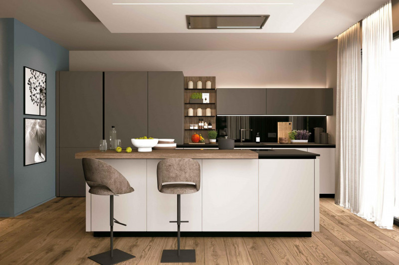 L'ingresso si apre su una zona living moderna con cucina a vista completa di elettrodomestici, uno spazio pensato per chi lavora, vive e riceve in un ambiente contemporaneo e funzionale.