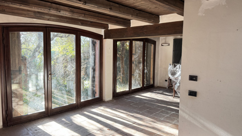 Lâingresso conduce direttamente in un ampio e luminosissimo salone, caratterizzato da grandi vetrate affacciate sul giardino che regalano luce naturale durante tutto il giorno. Lâambiente è impreziosito da un caminetto funzionante e da travi a vista presenti in tutta la casa, che donano calore e carattere agli ambienti.