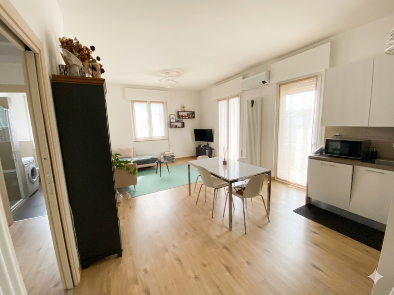 Lâingresso si apre su una luminosa zona giorno con angolo cottura, ben organizzata e accogliente, arricchita da un pratico ripostiglio utilizzabile anche come lavanderia.