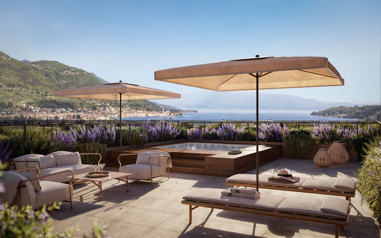 Saló, attico trilocale di 116 mq calpestabili con vista lago, servito da ascensore, con terrazza vista lago di oltre 77 mq e solarium superiore di oltre 117 mq con piscina privata di 21 mq, l'attico fa parte di un lussuoso contesto in fase di realizzazione.