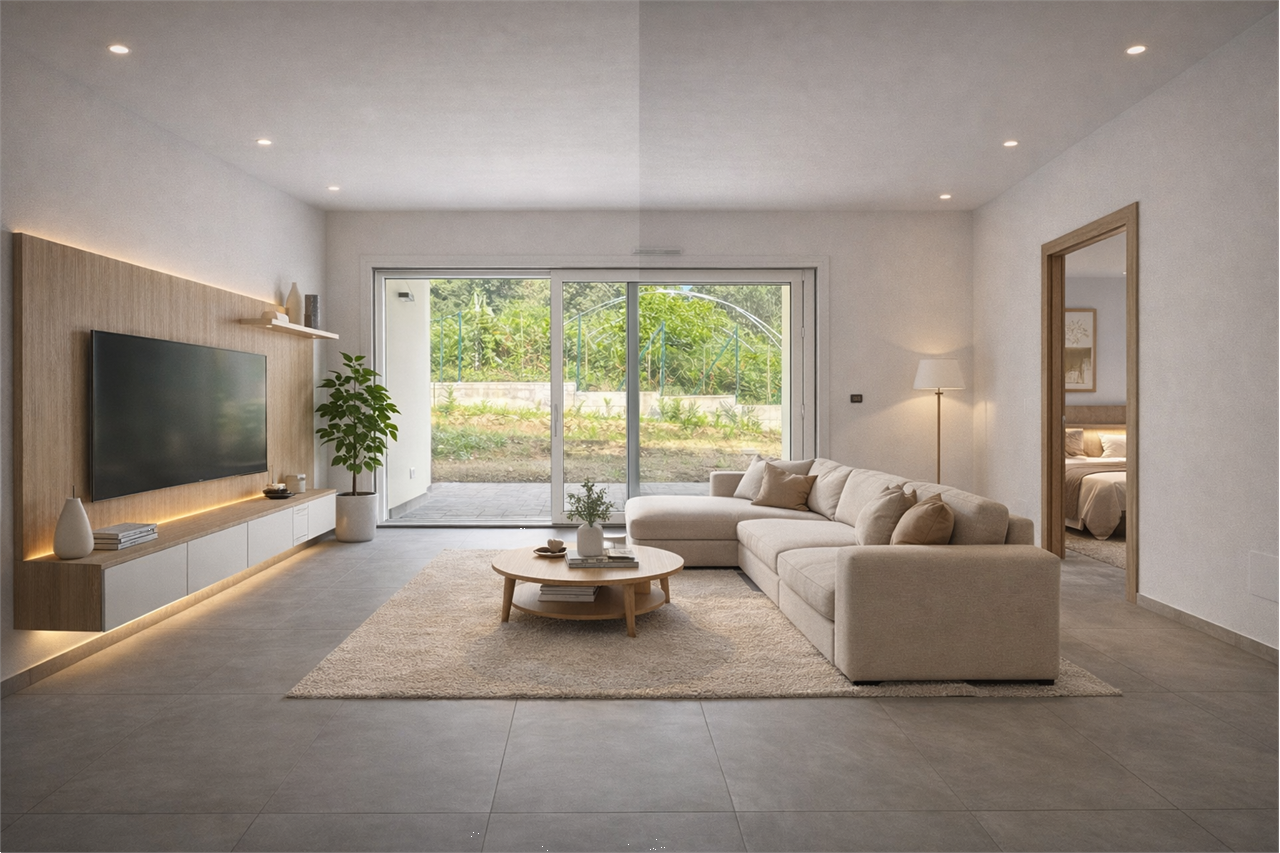 L'ingresso è sul soggiorno con cucina a vista e affaccio nel giardino o terrazzo tramite ampie vetrate scorrevoli, mentre un comodo disimpegno conduce alla zona notte, dove troviamo camera matrimoniale, seconda camera, bagno di servizio con doccia e bagno padronale finestrato.