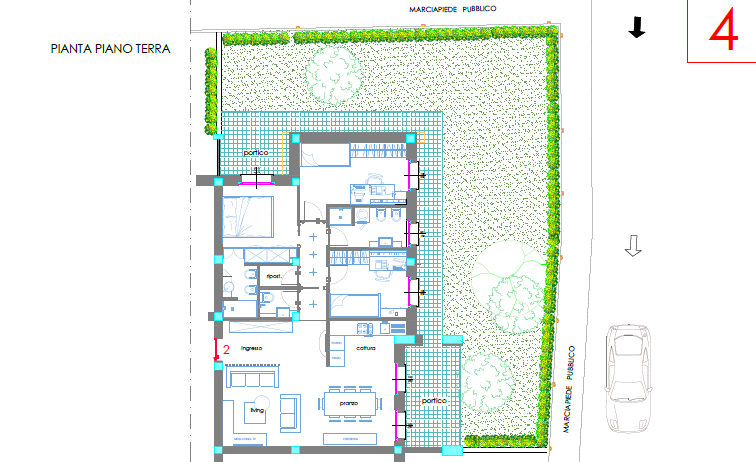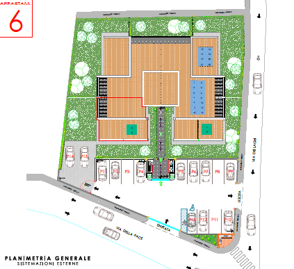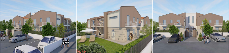 Giardino piantumato di circa 500 mq, pannelli fotovoltaici, posti auto, piscina in comune con villa bifamiliare adiacente.