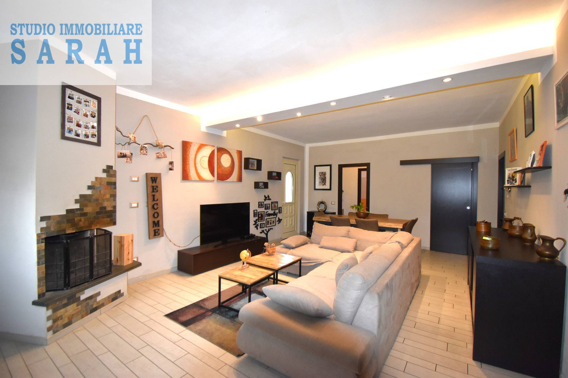 L?ingresso si apre direttamente sulla zona giorno, un ambiente accogliente e ben distribuito dove troviamo un?ampia sala impreziosita da camino, perfetto per creare un?atmosfera calda e conviviale, e un funzionale angolo cottura integrato nello spazio living.