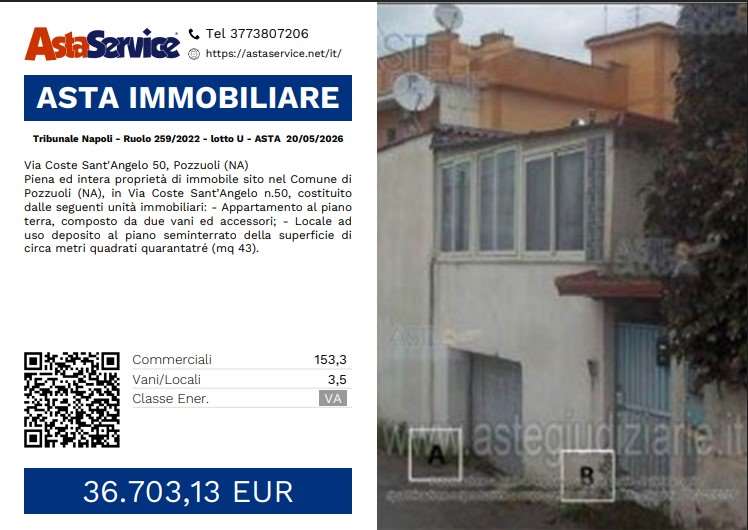 Piena ed intera proprietà di immobile sito nel Comune di Pozzuoli (NA), in Via Coste Sant'Angelo n.50, costituito dalle seguenti unità immobiliari: - Appartamento al piano terra, composto da due vani ed accessori; - Locale ad uso deposito al piano seminterrato della superficie di circa metri quadrati quarantatré (mq 43).