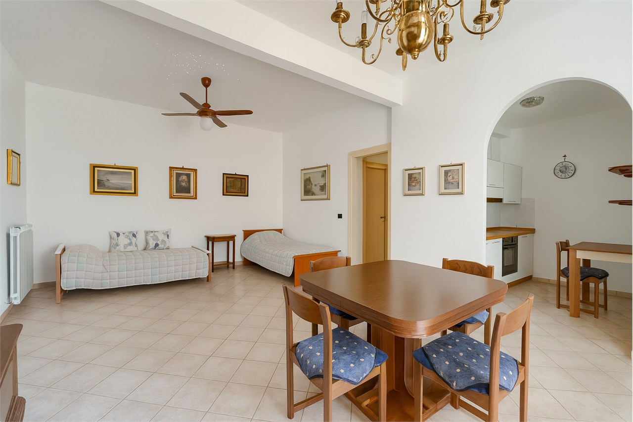 Situato al piano rialzato di un elegante stabile risalente ai primi anni Settanta, in un contesto privilegiato, centrale ed adiacente al lungomare con la sua vasta offerta di spiagge e amenit?, l'appartamento inserzionato ? un bilocale di ampia metratura, composto internamente da un disimpegno (arricchito da due capienti armadiature a muro), un luminoso soggiorno dotato di cucina a vista, una camera matrimoniale con armadio a ponte, un'abbondante sala da bagno con doccia ed una preziosa veranda soleggiata a ridosso del verde condominiale, curato e accessibile in via esclusiva all'abitazione.