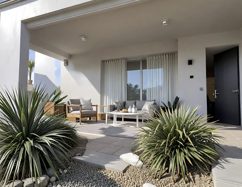 Appartamento midi al piano terra con ingresso su zona giorno openspace dotata di ampia vetrata scorrevole, dalla quale si accede al portico esterno di 15,83 mq., ideale per pranzi estivi e al giardino privato di 117 mq.