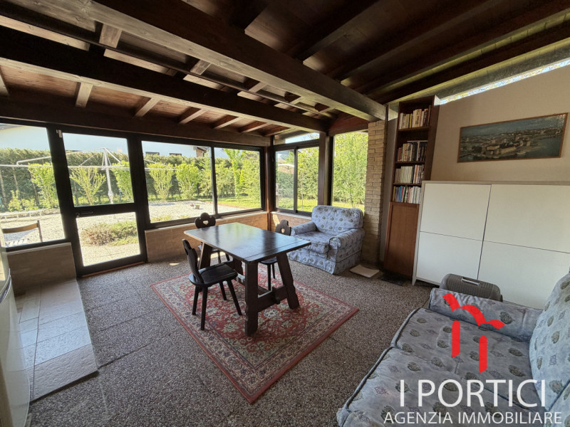 Al piano terra accoglie un soggiorno doppio molto luminoso grazie alle grandi finestre, zona pranzo separata perfetta per ospitare numerose persone, pratico cucinotto finestrato e bagno completo. Dal disimpegno si accede ad una suggestiva veranda esposta a sud: ambiente ideale come salottino panoramico sul verde circostante. Completano il piano due garage spaziosi (37 mq + 24 mq), soluzione ideale anche per chi necessita spazio hobby/laboratorio.