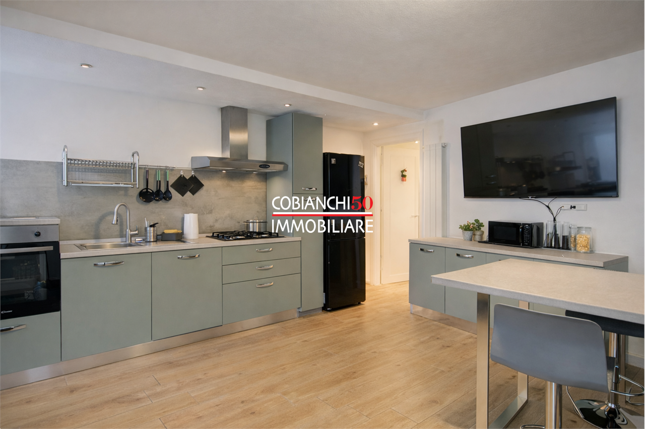Una porta separé in legno e vetrate conduce al piccolo angolo cottura ben fornito di elettrodomestici e cucina a metano. Abbiamo infine un bagno con vasca e scaldabagno elettrico.